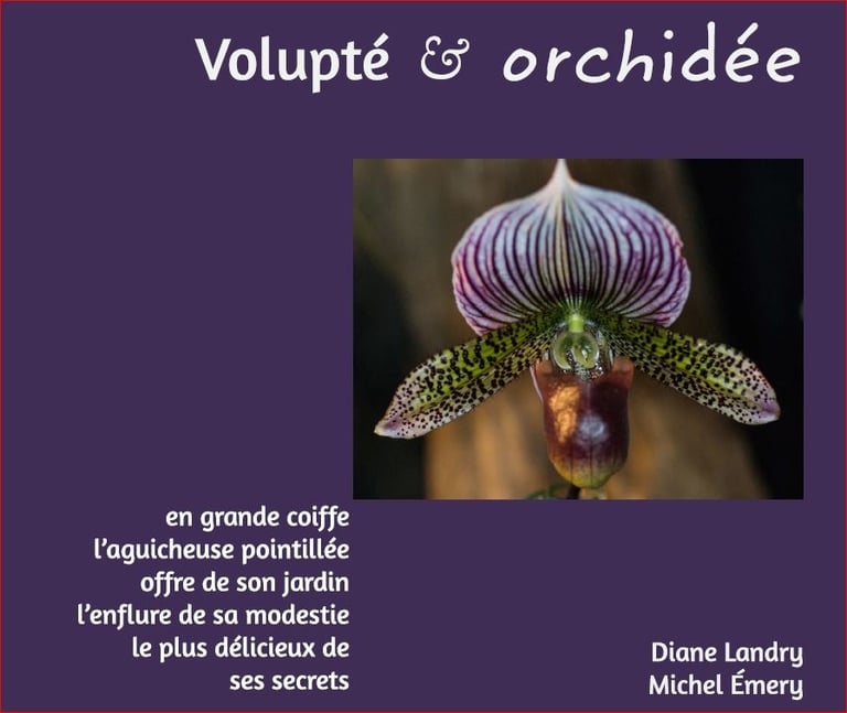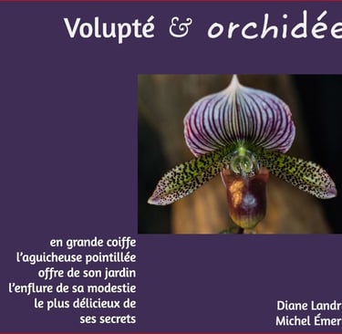 Ce projet de livre collaboratif est né du désir de produire un album photo d’orchidées original, en images et en mots, qui parvienne à traduire la sensualité époustouflante de ces belles de la nature. Moi et Diane Landry (une amie auteur et photographe). Nous avons mis en commun notre savoir-faire dans un climat de grande complicité. Les fleurs ont été croquées par moi lors de l'exposition OrchidExpo à Montréal, et une fois les photos choisies, Diane s’est prêtée au jeu d'agencer sur mesure une série de textes brefs de son cru, un brin coquins, avec un minimum de contraintes! Poèmes, aphorismes, calembours et prose poétique (ainsi qu’une micronouvelle) se succèdent, pimentant l’ouvrage abondamment illustré de photos d’exception des fleurs en mode séduction. La plume est inspirée, ludique et pudique… mais résolument suggestive.